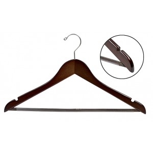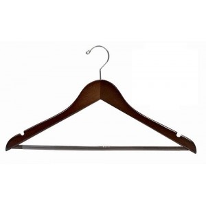 Walnut Finish Chrome Hook 18" Length 2" Width Exclusive walnut finish deluxe wooden hangers designed to protect suits. The vinyl covered bar prevents slippage and creasing of your pants. ...Price:
